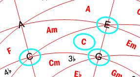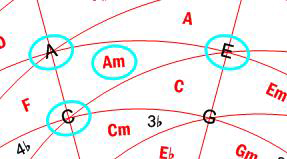 In Fig. 11, we can see how the notes composing the C and Am chords are so easily found by using the Harmonic Wheel.
