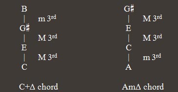 An Augmented, Major 7th Chord is a 4 note chord, built by superimposing two M 3rd and one m 3rd intervals (in this sequence). Thus, for example, the C Augmented, Major 7th chord is composed by notes C, E, G , B. This chord is represented by “C+ ”.