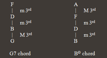 A half-diminished Chord is a 4 note chord, built by superimposing two m 3rd and one M 3rd intervals (in this sequence). Thus, for example, the B half-diminished chord is composed by notes B, D, F, A. This chord is represented by “B ”. It is worthwhile to point out that, in this chord, a d 5th (tritone) is formed between the root and the 5th of the chord (in the example, between B and F).