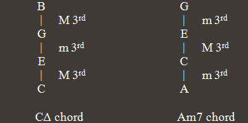 A Major 7th Chord is a 4 note chord, built by superimposing a M 3rd, a m 3rd and a M 3rd intervals (in this sequence). Thus, for example, the C Major 7th chord is composed by notes C, E, G, B. This chord is represented by “C ”.